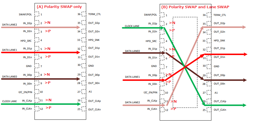 SWAP/POL = L: receive lanes swap (redriver and retimer mode) -> Block diagram B without polarity swap