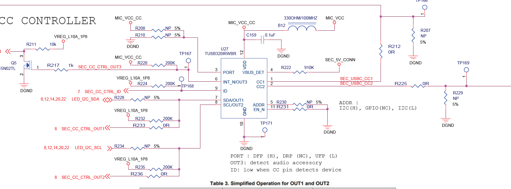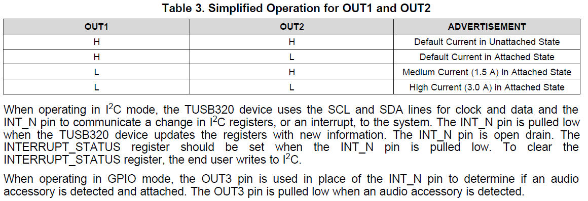 The pin7&8 of TUSB320 can be configured as I2C or GPIO mode by ADDR pin, we'd like to confirm with you about the Table 3. Simplified Operation for OUT1 and OUT2' in the datasheet. Due to this CC-controller is connected type C connector, we want to know need plug-in which type C device/adaptor then to we will measure the OUT1 and OUT 2 behavior and charging current is meet spec defined or not.