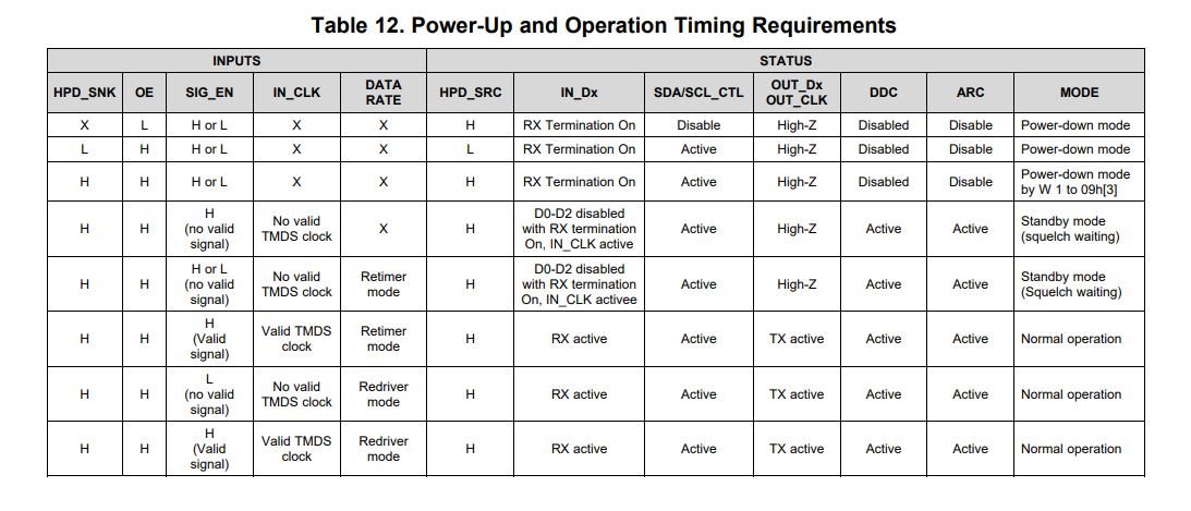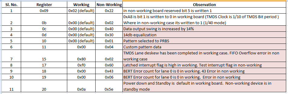 We are using TMDS181 for HDMI Sink application. Initially Pin strapping settings were given and later we have enabled I2C for debugging purpose. Currently in one board, we are able to get the input properly for 1080p and everything looks fine. In another board we are not getting input. So we checked TMDS clock out from the IC and found that its not coming, but till IC input pin 148.5MHz clock is observed from connector. Even though the hardware configuration remains same behavior of the ICs are different. Later for debugging, we have compared register sets of both working and non-working ICs and found there are differences in few registers. 0x0b register value is 0x00 for working board and 0x02 for non-working board, which means TMDS clock is set for 1/40 of TMDS period in non-working board whereas its 1/10 in working board. To solve this, we tried writing the 0x0b register manually and found that bit 1 of 0x0b register is not getting changed. As per TI data sheet, this register is set by value of 0xA8 register value. Also it should get cleared when HPD_SINK is asserted for more than 2ms. In our case this is not happening its always set to 1. How to solve this issue..? I'll attach the compared register set values, kindly go through it and support us to solve this problem.