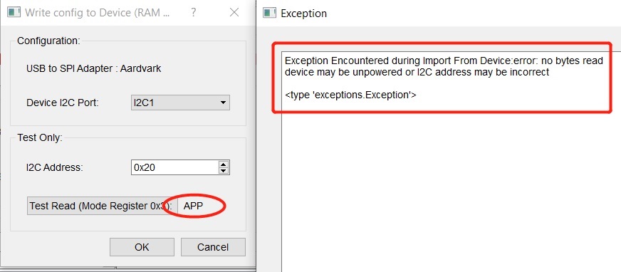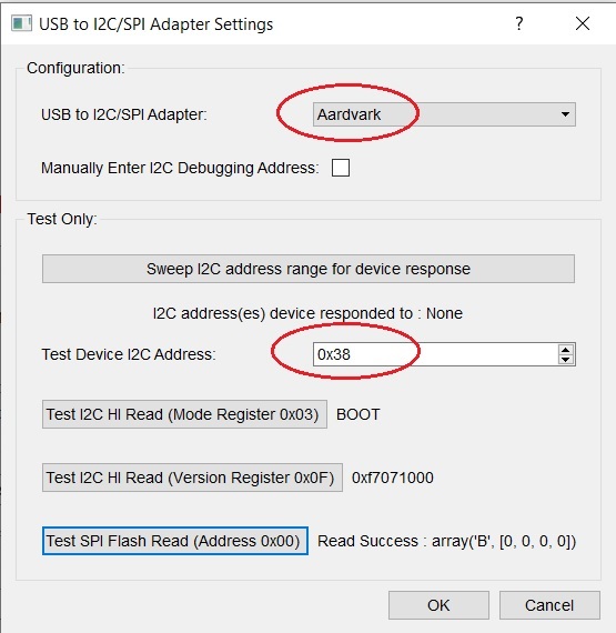 Once you have confirmed your adapter, please flash your device by the following method: Binary > Flash from current project. Power down the device. Then go to the debug mode, and check the mode register. Let me know your results.