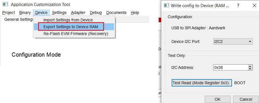 I tried your binary file that you sent me. I received the message "SPI Flash to device successful". Then I cycled power on the EVM and went into debug mode and saw that the mode register 0x3 (in the debug register tab) was in APP mode.