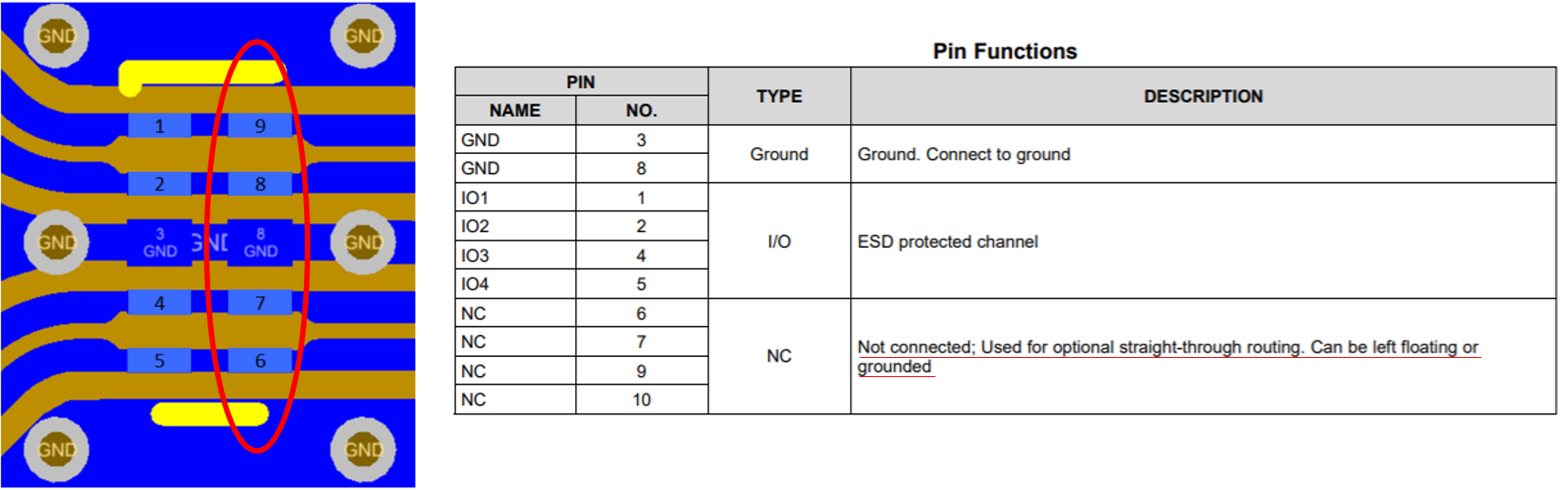 Datasheet says Pin 6, 7, 9, 10 are defined as "Not connected" pins. But for straight-through routing, those pins might be connected to signal lines as describing in the datasheet as below.