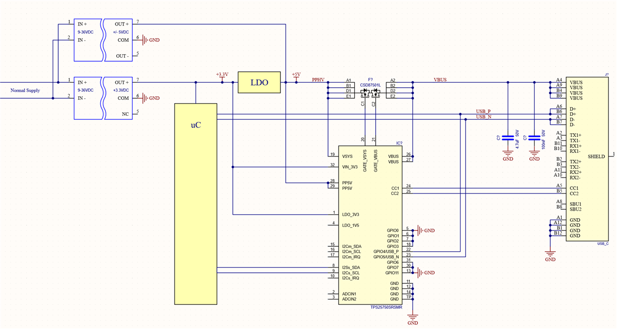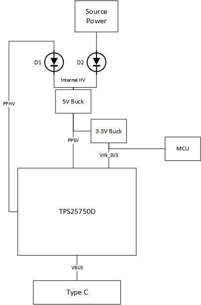 I have attached a diagram roughly outlining how I thinkt the TPS25750 should be connected for this.