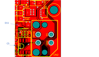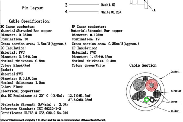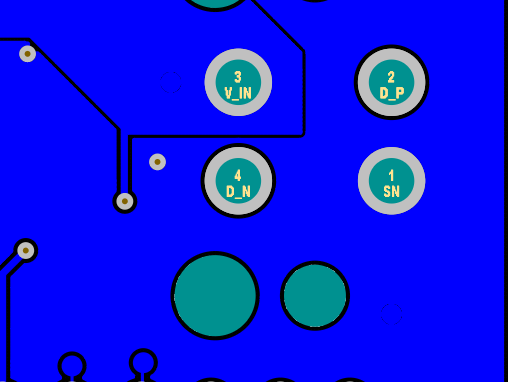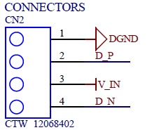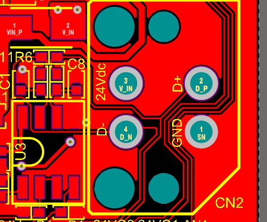 - The PCB is tested through a cable connected to CN2 (4meters). This cable routes VIN (5-32V, 24V nominal), DGND, Data+, Data -.