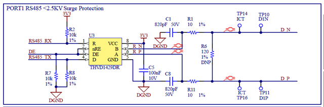 - The Surges tests at 2kV into VIN and DGND signals is not OK as the THVD1429 chip is short-circuited internally through Data+ & Data- & 3V3 & DGND. (the rest of the PCB electronics are alive).