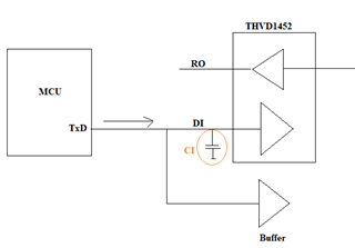 MCU TxD pin (Serial communication interface) is driving Two inputs One is THVD1452 Driver Input and other is buffer input.