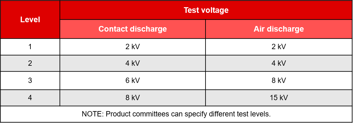 The ESD immunity test is conducted successively at levels 1-4 with the option of adding additional levels above, below, or in between the others. Level 1 represents the lowest required test with a contact discharge voltage of 2kV while level 4 represents the highest with a voltage of 8kV. Additionally, the test can be conducted in different mediums such as oil and air.