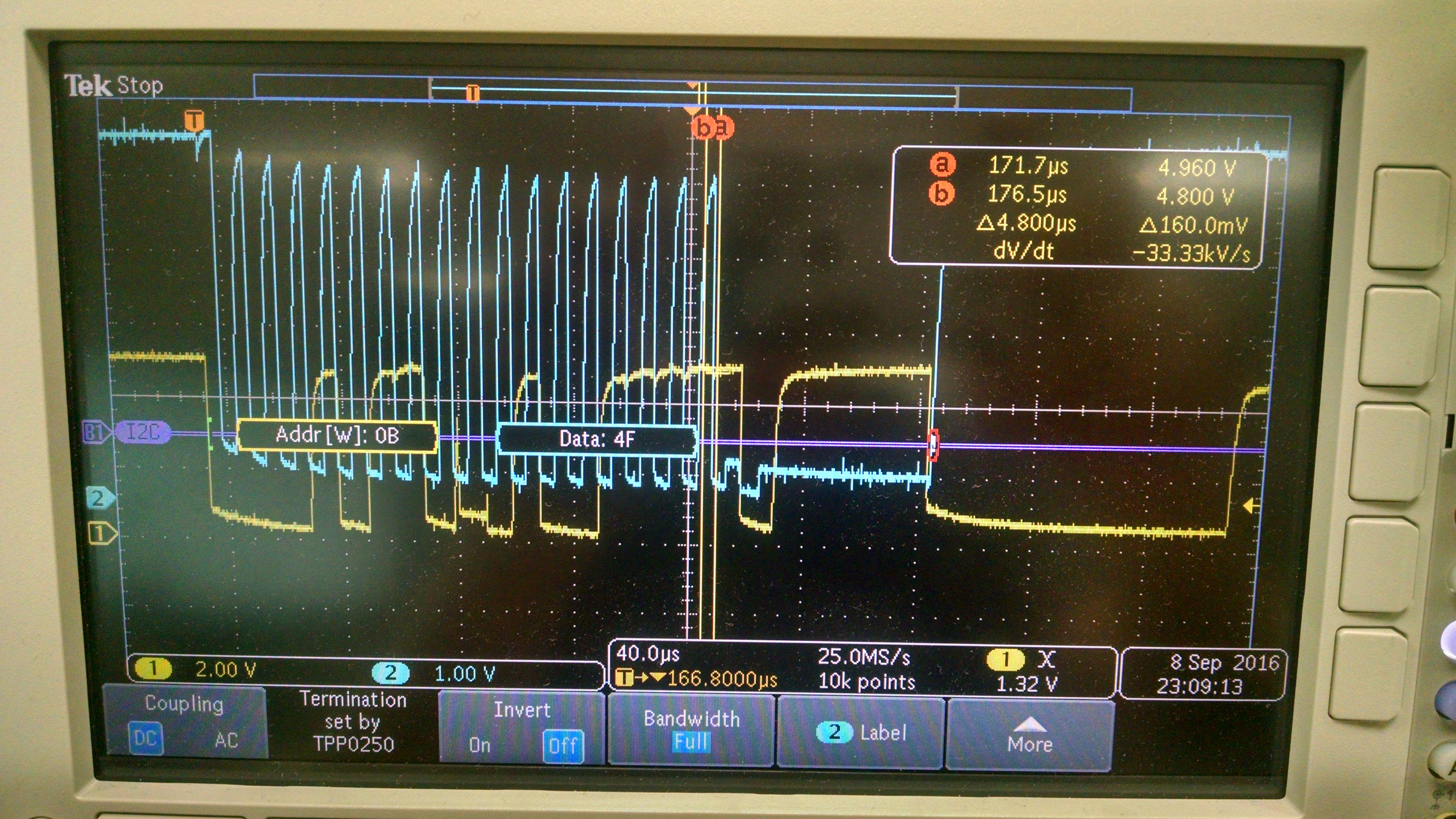Shown below is a screenshot of a scope hooked up to the clock (blue) and data (yellow) lines close to side 2 of the isolator. The length of connection between the isolator and battery is about 18inches 22AWG, which may explain some of the variation in logic low levels due to ground offsets. However, I am concerned about the logic low levels initiated by bq78350 and whether the isolator is translating them to side 1.