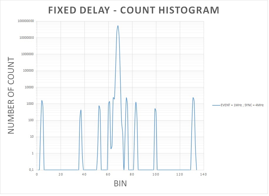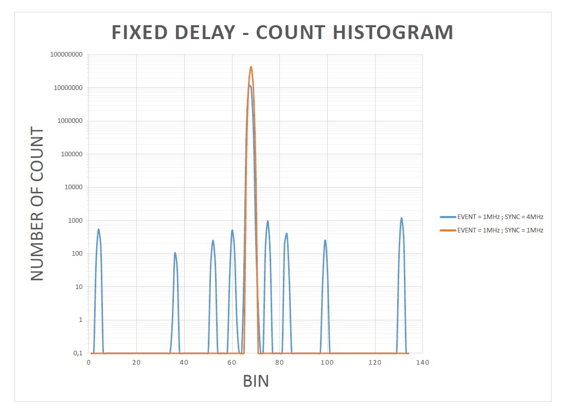 - When using the exact same event input (1 MHz), but a reference clock at 4 MHz, some quantification error start to occur generating really weird histograms. Some smaller peaks appear at (Main peak + 8/16/32 bins). I have attached a picture of this histogram. I have used a logY axis to show more clearly the problem.