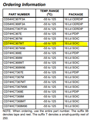 CD74HC367 is the generic part number. The M denotes the package type, in this case a 16 pin SOIC. The T indicates that a small-quantity reel of 250.