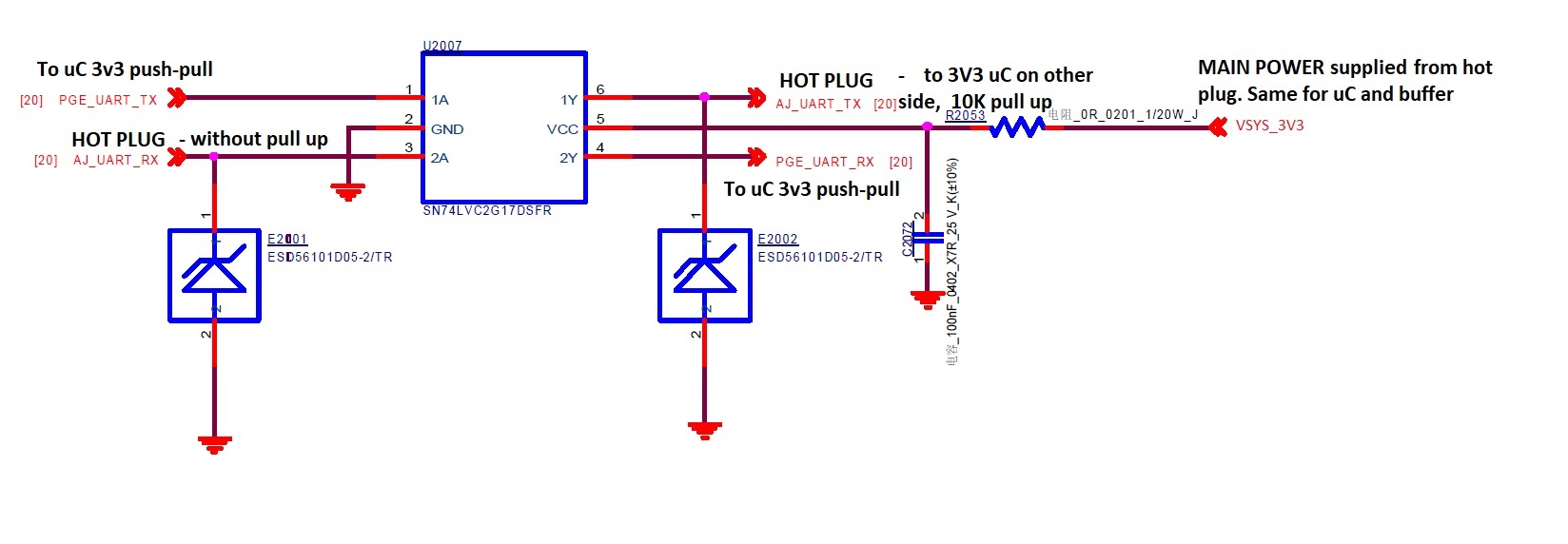 I have several possible variants what's going on. Device has UART and power supplied through 2.5m cable, marked as hot plug on picture with ESD protection on input.