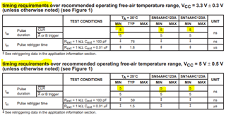 I am looking for support in generating edge triggered pulse widths between 10 and 25 ns. According to the sn54ahc123a datasheet: https://www.ti.com/lit/ds/scls352h/scls352h.pdf it appears that according to pp. 5 a 5 ns output pulse is possible. However an app note I found: https://www.ti.com/lit/an/scla014/scla014.pdf?ts=1649785130686&ref_url=https%253A%252F%252Fwww.google.com%252F says on pp. 3 that the minimum output pulse duration is 290 ns (but this seems in conflict with the datasheet--in particular pp. 11, fig. 5--though that app note is no longer linked on the product website so maybe that information is out of date). Can you achieve pulse lengths as short as 10-25 ns with that part, and if so, how can that be achieved? If not, is there another part I might consider? Thanks,
