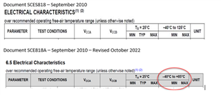 Per our email, while the PCN referred to is for thermal, please note that the datasheet's electrical characteristics temp range will be updated and it is recommended to use the temperature under the datasheet’s operating free-air temp, thanks.