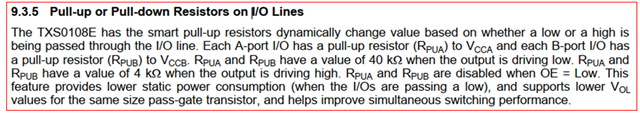 2. As shown in 9.3.5, when the Output is high, there is a 4k pull-up resistor. If the following circuit signal is added with a 1k pull-down, will the actual output high level be 1/5 VCCA (half-high level) and cause the signal to work abnormally?
