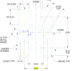 Here is another AutoCAD file showing the land pattern, stencil overlaid and to scale. The stencil lines (red) line up with the land pattern solder mask lines (green), except for the stencil offset for the center triangles. Which is needed for solder release from the stencil.
