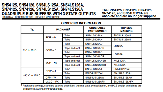 - SN74LS125ANSR (SOP): Packaging is only "Tape and reel", so TI doesn't sell SN74LS125ANS
