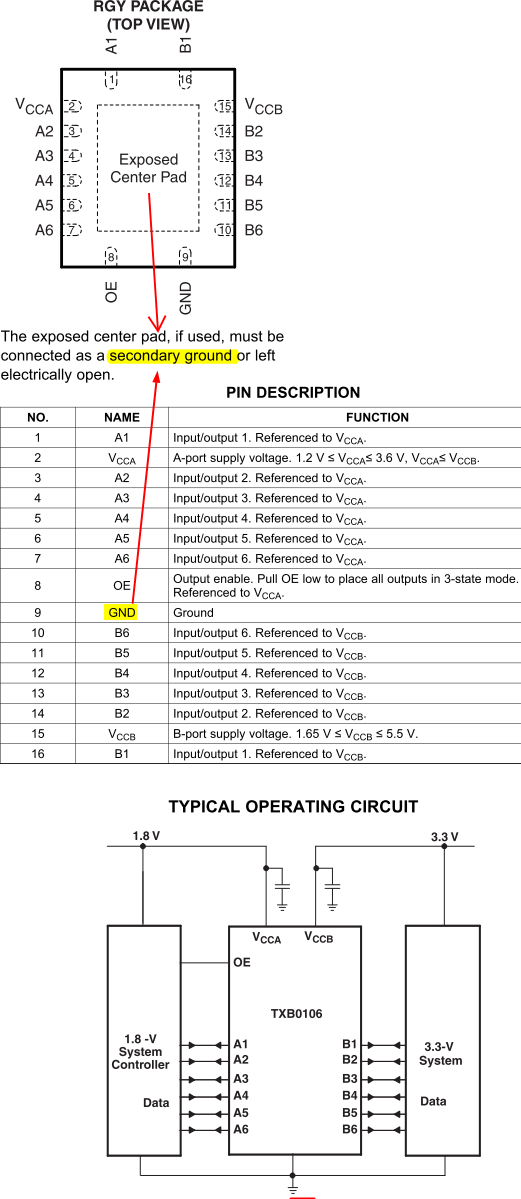 For TXB0106, there RGY package, there is an "Exposed Center Pad" at the center.