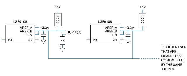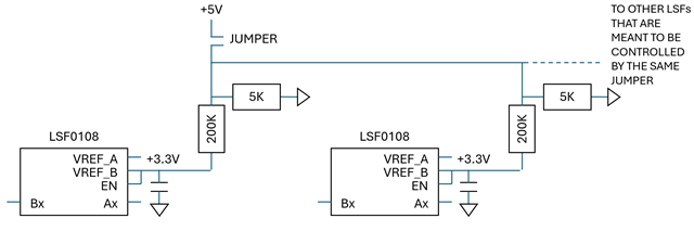 I would like to enable and disable multiple LSF0108s with the same jumper. I believe I have biased the LSF0108s properly so that they can be disabled when the jumper is populated, but is there any issue when VREF_B and EN pins between multiple LSF0108s are shorted together when they are meant to be enabled? Could the VREF_Bs or ENs somehow contend with each other?