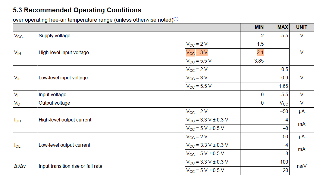 Issue: They connect pinA and pinB together and when input signal is up to 1.1V and then output will down to 0V. VIH is 2.1Vmin in datasheet.