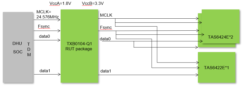 Other Parts Discussed in Thread: TAS6424E, , SN74LVC1G08, TXB0104, SN74AXC4T245