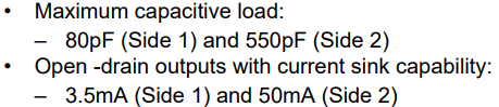 Since the I2C protocol limits the allowable bus capacitance to 400pF (for Standard and Fast Mode) or 550pF (for Fast Mode+), similar requirements will need to be implemented on the TXG8122-Q1.