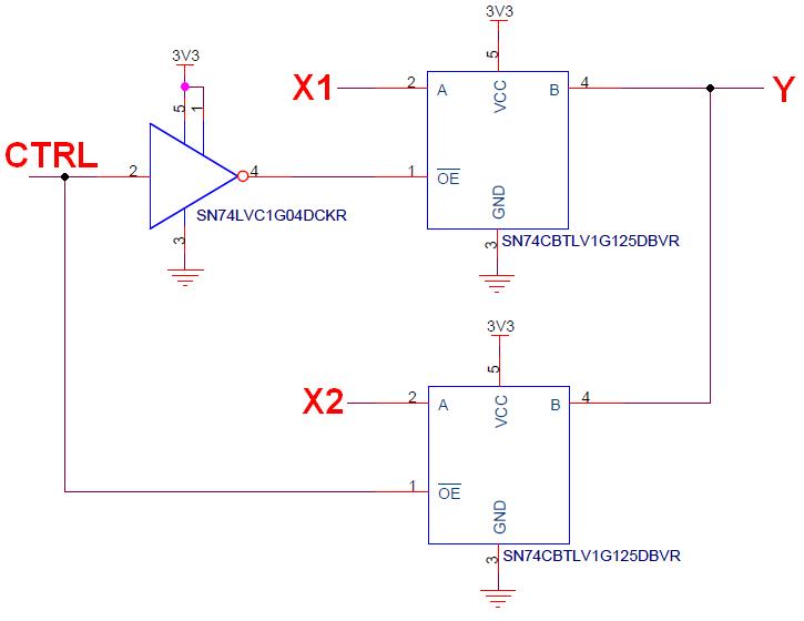 CTRL signal can only toggle once on boot time. But Ten / Tdis delays are 4ns. This means output of the two SN74CBTLV1G125 can be shorted approx.4ns.
