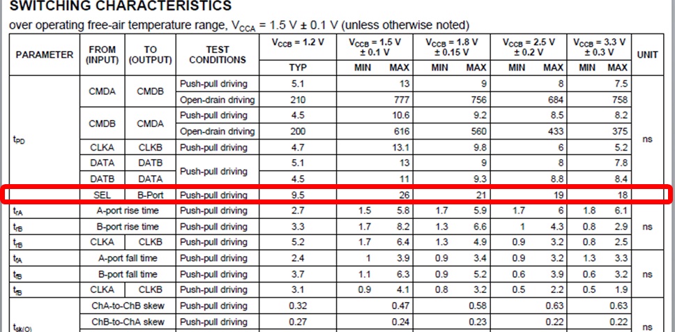Could you please kindly let me know the transition duration time(max) from B0 to B1 of DAT/CLK/CMD by "SEL pin from L to H"?