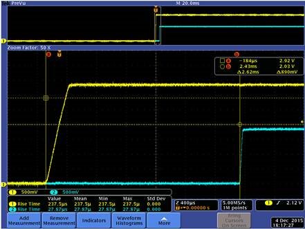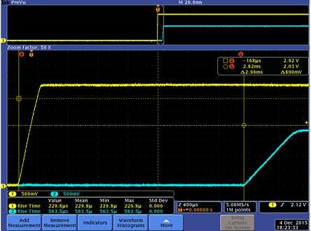 Below is the waveform, yellow is the VCCB(3.3V), blue is the VCCA (1.8V).