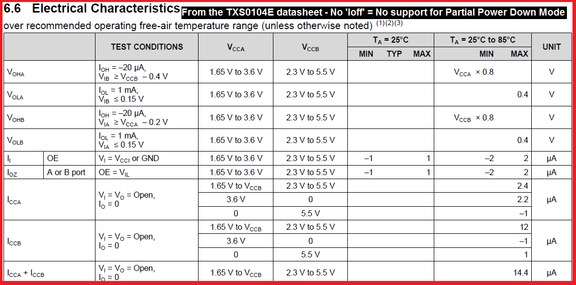 Now look at the TXS0104E datasheet, notice that there is no 'Ioff'. This means that Partial Power Down Mode is not supported.