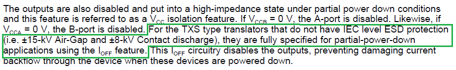 Also, shown below is a portion of the application note that you mentioned. It states that Ioff is supported in TXS devices that do not have IEC level ESD protection. The TXS0104E does have IEC level ESD protection, so therefore it does not support Ioff.