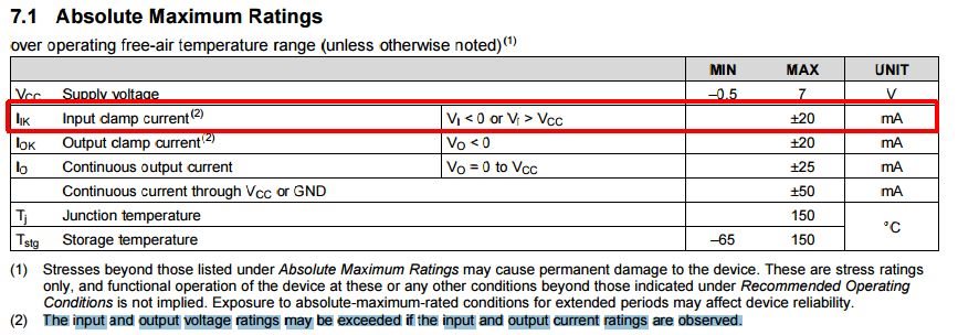 The abs max ratings state the input clamp current when Vi<0 and Vi>Vcc . TI doesn't guarantee performance for violating the recommended conditions and violating abs max can cause reliability issues.