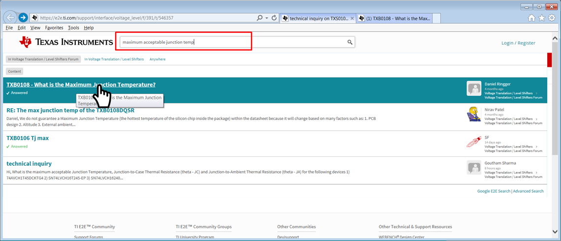 One way to use E2E is to literally type the question into the search bar above. As you see below I typed in "maximum acceptable junction temp" and found the following posts. Clicking on the post not only showed what is included on the datasheet but gave additional application information that which give insight on the part in its application.