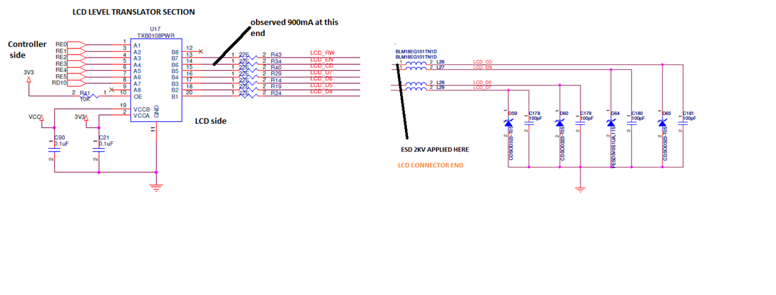 While applying 2KV ESD pulse at the LCD connector end the current shoots upto 900mA for a period of 60ns at the I/O port of Level translator.