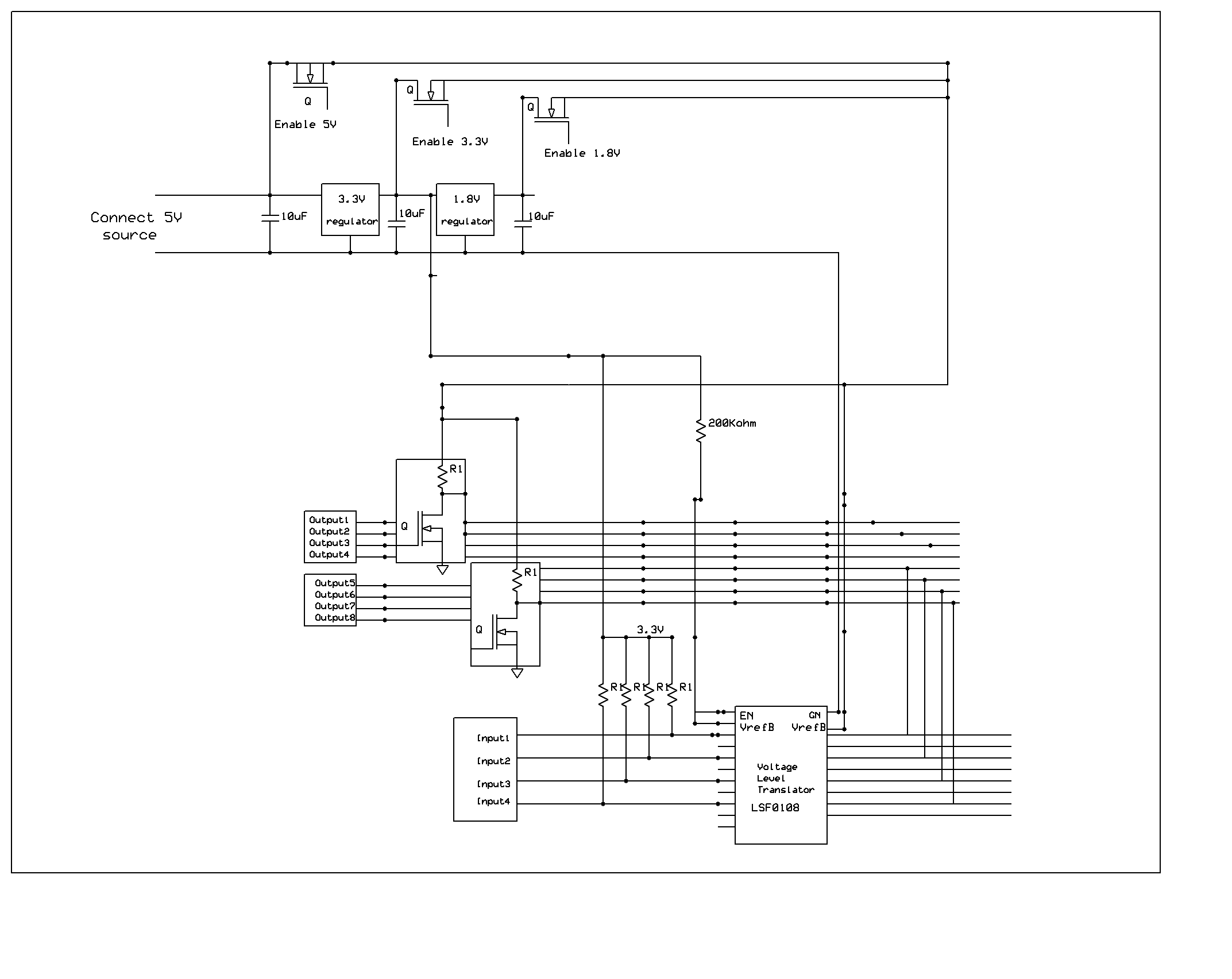 I am trying to implement bidirectional functionality using the above schematic diagram. The voltage regulators are to select the output voltage level. I always want to sense the input at the output lines 5,6,7,8 through voltage level translator. And I want the 3.3V always at the input side i.e at Vref A. While on B side I will be giving the inputs at 1.8, 3.3 and 5V pulses.