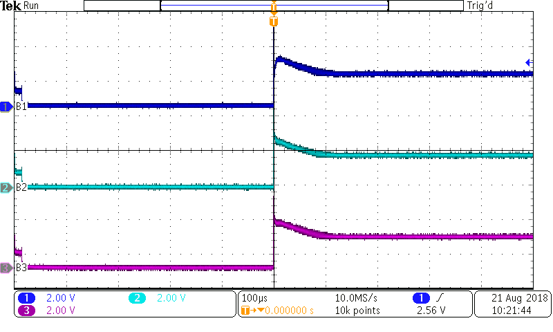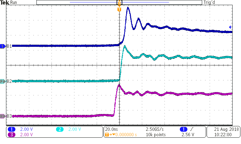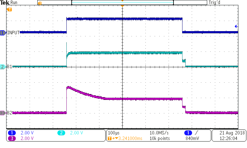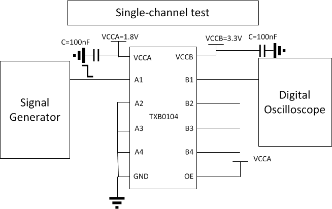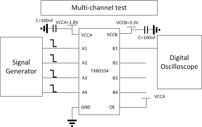 Our customer found that errors appeared in some channels of TXB0104 when every channel has input signal. I did some tests shown in below. And VCCA=OE=1.8V, VCCB=3.3V, input signal is f=1kHz, amp=1.8V square wave.