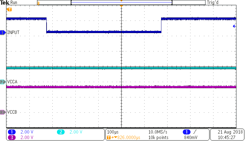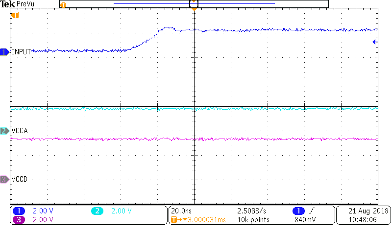 - I measured ICCA and ICCB when VCCA=OE=1.2V, VCCB=3.3V.ICCA is 0.005uA and ICCB is 0.5uA when VI=GND. And on the other hand, ICCA and ICCB both are 20uA when VI=VCCA. The ICC result is strange enough.