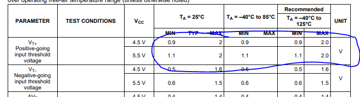 As you can see this device is also a Schmitt Trigger buffer with operating range of 4.5V to 5.5V. However it has much lower thresholds designed for lower inputs such as your application.