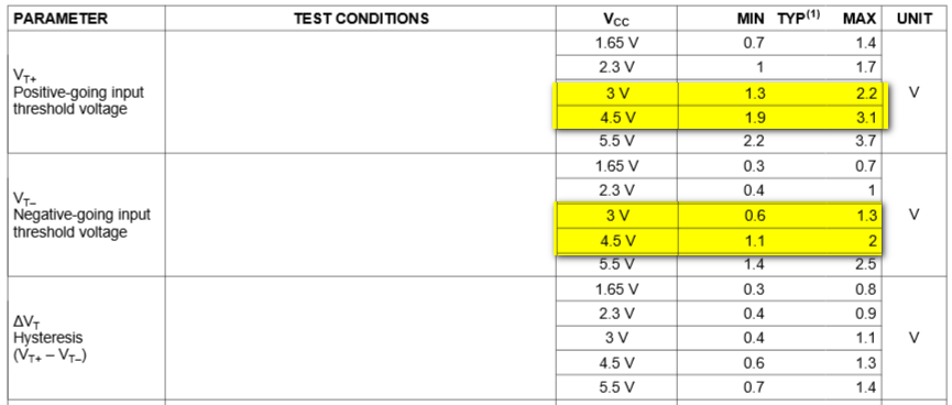 1. About SN74LVC2G17, my understanding is the trigger point is a range based on Vcc power level. If Vcc is 3.3V, the trigger point range of VT+ and VT- would be btw Vcc 3V and Vcc 4.5V. Correct?