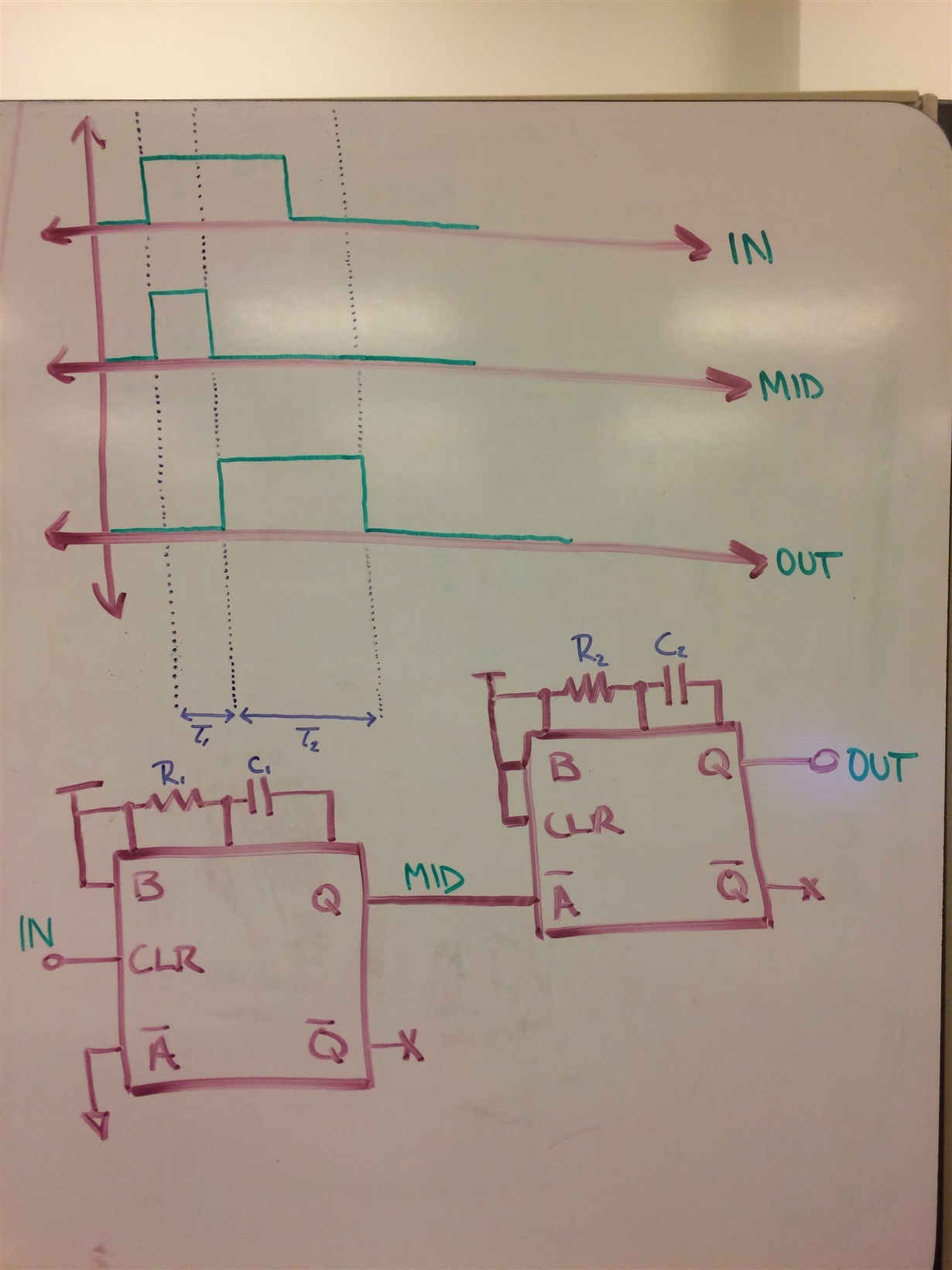 I am trying to design a circuit that receives a pulse on the input, waits 2us, and then generates a pulse on the output.