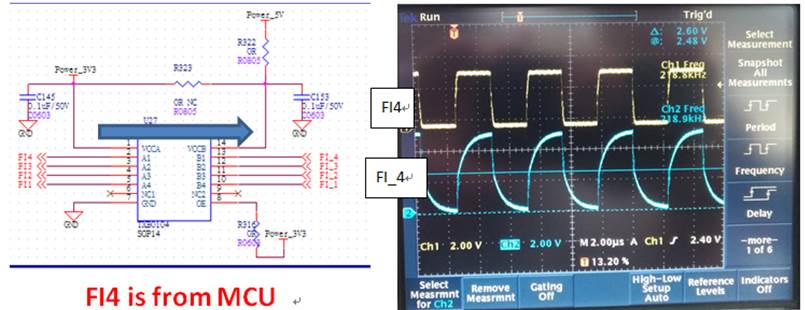 FI4’s signal (3.3V) through TXB0104 then output FI_4 (5V) but FI_4 waveform is severely deformed. (as below)