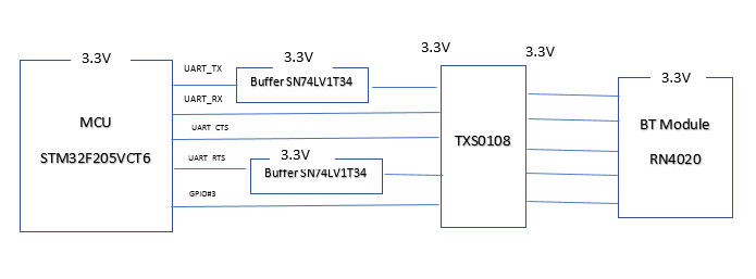 When I'm trying to connect TXB0108 for translating 5V system UART signal and GPIOs to 3.3V Bluetooth module RN4020. The GPIOs and TX line are getting shifted to 3.3V level but the BT module is not responding, means it is not sendinf Rx signal. Tried with 3.3V system with and without level shifter to check whether the issue is with level shifter or not, and it is found as without level shifter it is working fine.