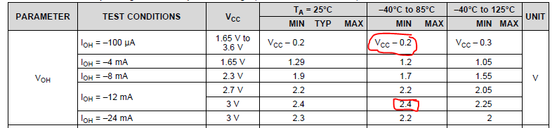We will be supplying the device with 3,3V. The VOH is the critical parameter and we can only “afford” to let the output voltage drop 0,15V from the supply, so with a nominal 3,3V supply, we need VOHmin >3,15 @IOH = 0,7mA