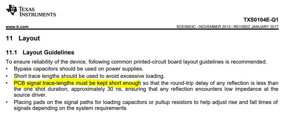 TXS0104-Q1 Layout guideline descript that the layout trace must keep short.
