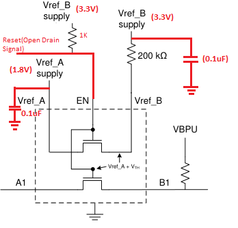 Hi, We are using LSF0108RKSR part in our application. We have connected 200K resistor to the VREF_B (3.3V) Power pin and we have connected system reset signal to EN pin. Is this connection is OK? or we have to connect Pull Up 200K resistor with VREF_B supply to EN pin as mentioned in datasheet ?