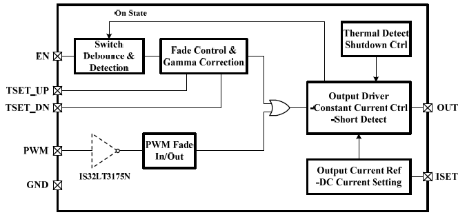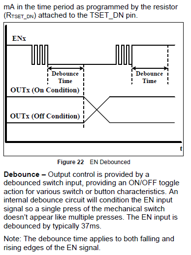My customer is working on a dome lighting solution. Their application requirement is that the LED can be toggled between IN and OUT condition with momentary contact switch. Their current solution is IS32LT3175, a LED driver with integrated debounce and latch circuit on EN pin to achieve this. We do not have led driver product with same feature, so I'd like to propose replacement solution with a logic device before our LED driver product.