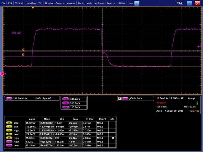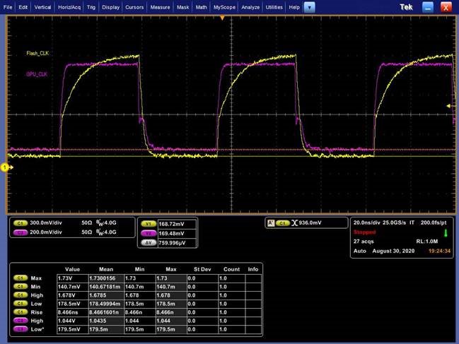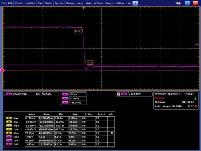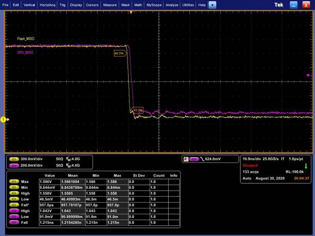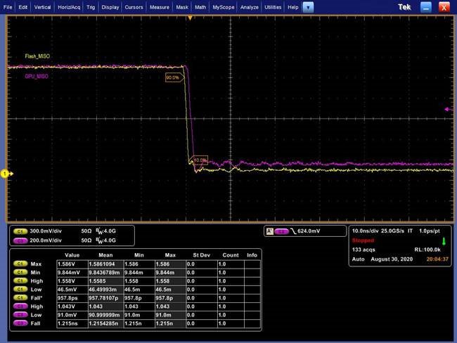 B side to A side( A side will have a negative undershoot) purple is A side output, yellow is B input.
