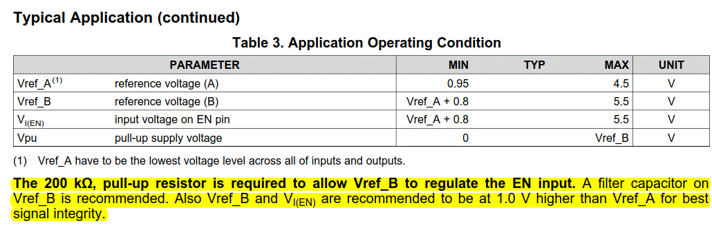 We see DS recommend Vref_B and Ven to be 1V higher than Vref_A so we change Vref_B to 3.3V(still keep port B pullup to 2.5V), see fig.2. The communication is established. Is it correct way to do for Vref_A, Vref_B delta < 1V? Cause we are wondering what if the system don't have extra higher voltage(Vref_A + 1V) for the case? The two waveforms looks similar, do you have any idea why fig.2 works? Both Vh < 2V.
