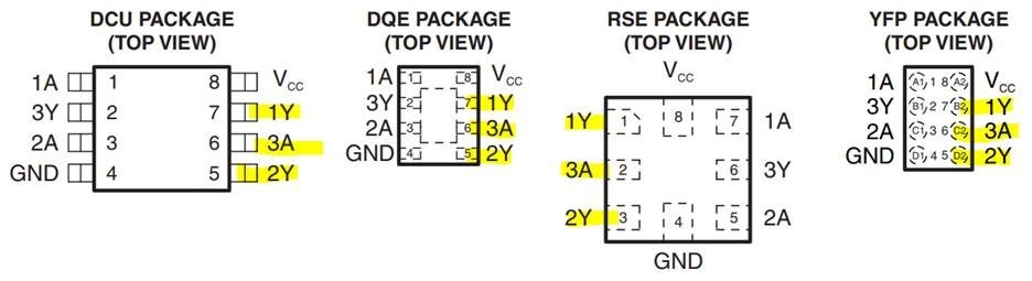 I noticed the SN74AUP3G06RSER (RSE package) has a different lead/pins configuration than the other packages of the same part number.
