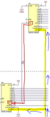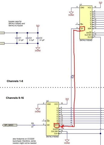 From TI reference design (TIDA-01509, https://www.ti.com/lit/pdf/tidrvh7), the U1 QH pin connect to U2 SER pin.
