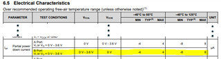The partial power down leakage current, shown for when one of the rails is shut down, is listed in the datasheet.